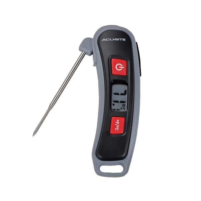 The thermometer features an on/off switch to preserve battery life, and can be read in Celsius or Fahrenheit.