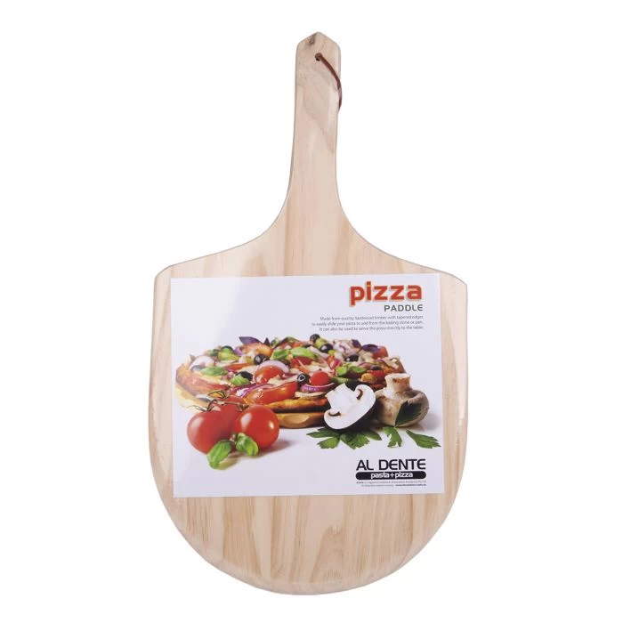 Made from natural quality timber, the Al Dente Pizza Paddle has tapered edges to easily slide your pizza to and from the baking stone or pan. It can also be used to serve the pizza directly to the table and features a leather strap for wall hanging.