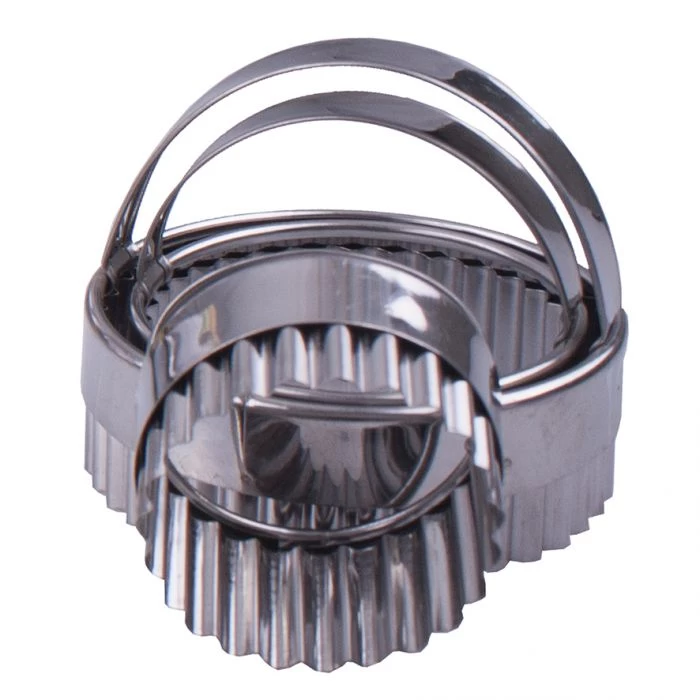 Whip up perfectly-sized scones, biscuits and pastries every time with these Appetito Crinkle Scone Cutters. The stainless steel set features three handy sized cutters – 4.5cm, 6.5cm and 7.5cm dia. – with sharp cutting edges to easily pierce the dough without sticking or impacting the aeration process. The crinkle effect adds a delightful homemade look to scones. Handles allow for easy cutting and even pressure and help to prevent finger marks on the scones or pastries.