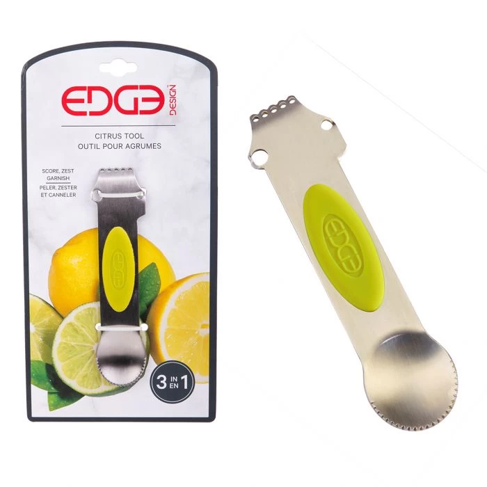 The tool, made from stainless steel with a silicone handle, easily strips zest from citrus fruits, using zest and garnishing blades, a side cutter for scoring the peel, and a serrated spoon to remove the peel.