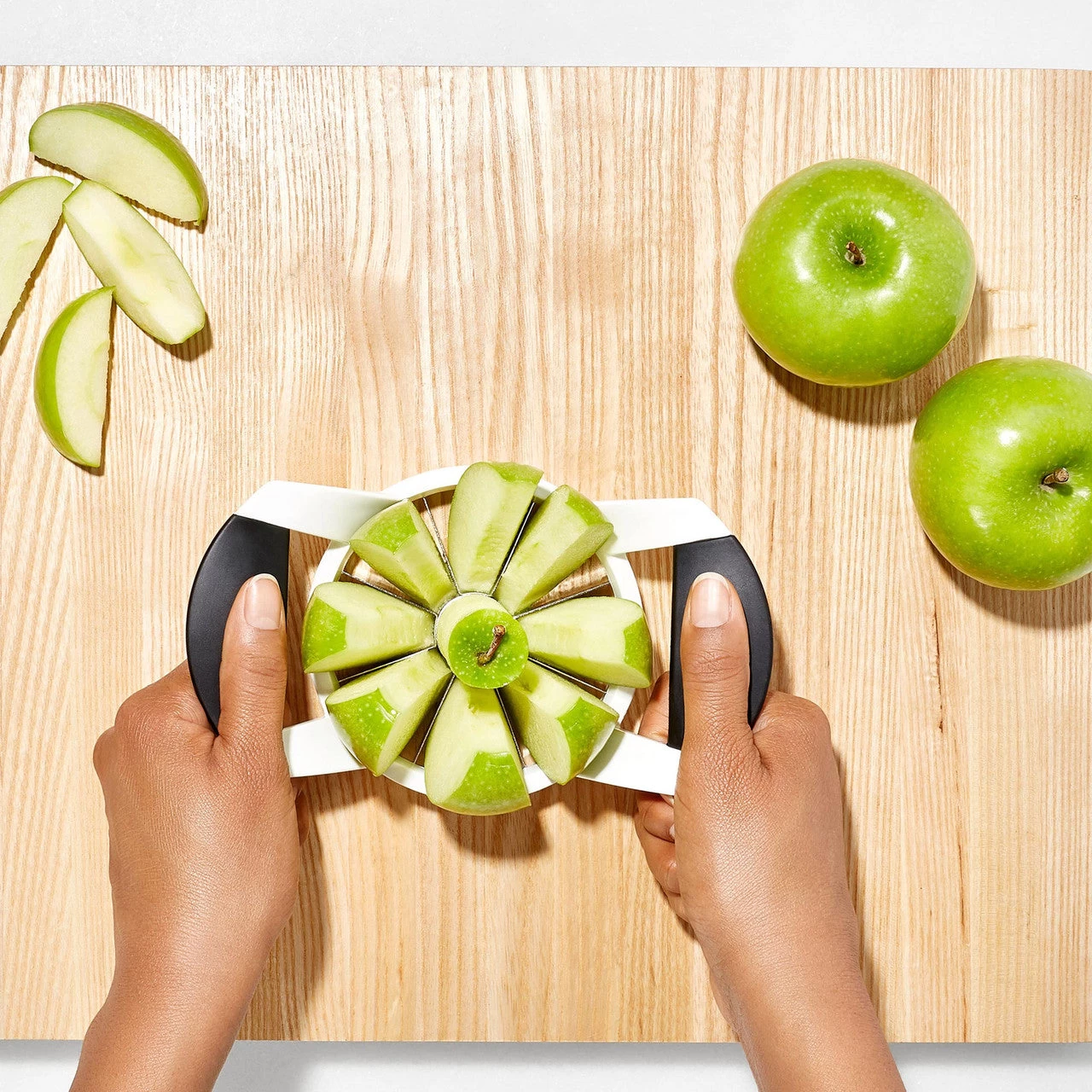 The OXO Good Grips Apple Divider features sharp, stainless steel blades that cleanly core and slice apples and pears with one press. The wide handles are raised to ensure ample clearance between your hands and your counter, and they provide a soft, non-slip grip for comfort and control. Dishwasher safe.