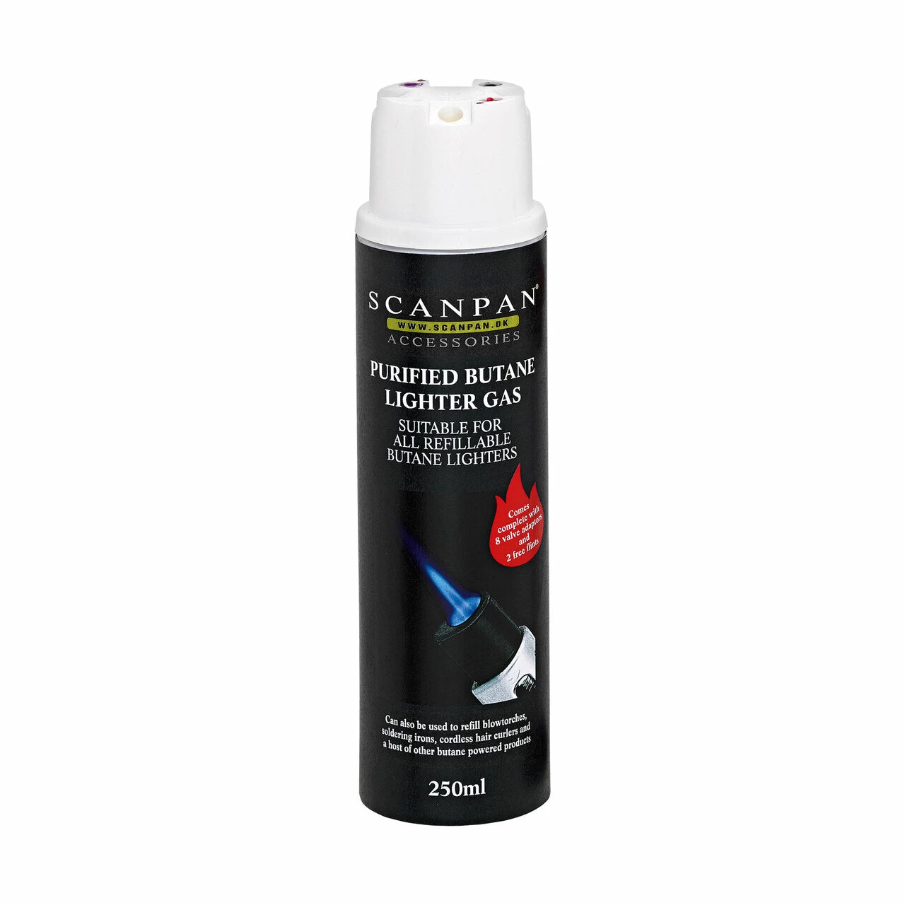 Classic Butane Gas Cylinder 250ml for refilling the SCANPAN Professional Chef’s Torch and also suitable for other refillable butane lighters.